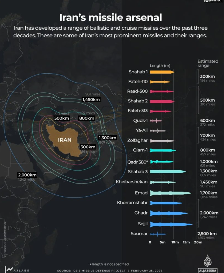 Οι πύραυλοι με τη μεγαλύτερη εμβέλεια μπορούν να διανύσουν απόσταση 2.000 -2.500 χλμ. Αυτό σημαίνει ότι μπορούν να φτάσουν στο Ισραήλ, στις αμερικανικές βάσεις στον Κόλπο και πιο βαθιά στην περιοχή. Ωστόσο, σε καμία περίπτωση δεν μπορούν να φτάσουν στις ΗΠΑ, όπως υποστήριξαν ορισμένοι συνεργάτες του Ντόναλντ Τραμπ.