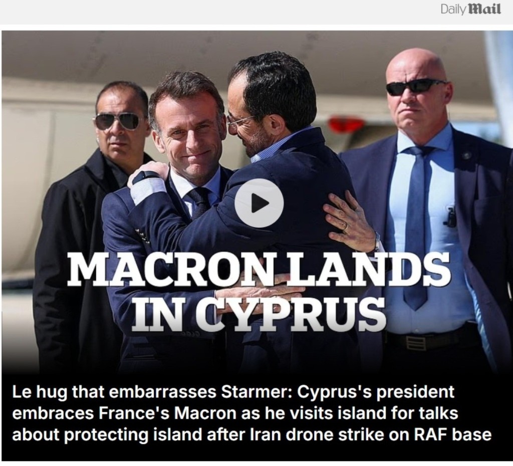 Ο θερμός εναγκαλισμός του Κύπριου προέδρου, Νίκου Χριστοδουλίδη, με τον Γάλλο ομόλογό του περιγράφηκε από τη Daily Mail ως «η αγκαλιά που ντρόπιασε τον Στάρμερ». Το δημοσίευμα υπογραμμίζει ότι η επίσκεψη Μακρόν στην Κύπρο πραγματοποιήθηκε την ώρα που το γαλλικό αεροπλανοφόρο Σαρλ ντε Γκωλ κατευθύνεται στη Μεσόγειο, συνοδευόμενο από πλοία τεσσάρων άλλων κρατών-μελών της Ευρωπαϊκής Ένωσης, προκειμένου να στηρίξει την άμυνα της Κύπρου μετά από έκκληση του Χριστοδουλίδη.