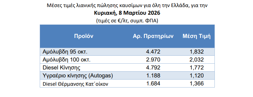 Σύμφωνα με τα τελευταία στοιχεία από το Παρατηρητήριο Υγρών Καυσίμων του υπουργείου Ανάπτυξης από τις 28 Φεβρουαρίου που έγινε η επίθεση ΗΠΑ και Ισραήλ στο Ιράν και μέχρι χθες 8 Μαρτίου, οι τιμές των καυσίμων στην Ελλάδα βρίσκονται σε ξέφρενο ράλι ανόδου με το πετρέλαιο κίνησης και θέρμανσης να έχει αυξηθεί σε διψήφια ποσοστά.