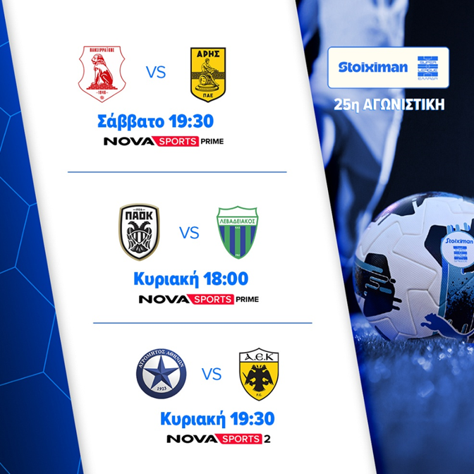 Η Stoiximan Super League, συνεχίζεται με την 25η αγωνιστική και τους αγώνες Πανσερραϊκός – Άρης (14/3, 19:30), ΠΑΟΚ – Λεβαδειακός (15/3, 18:00), Ατρόμητος – ΑΕΚ (15/3, 19:30) που θα μεταδοθούν από τα κανάλια Novasports. Στα κανάλια Cosmote Sport θα μεταδοθούν οι αγώνες ΟΦΗ – Ολυμπιακός (14/3, 17:00), ΑΕΛ Novibet – Asteras Aktor (14/3, 20:00), Κηφισιά – Βόλος ΝΠΣ (15/3, 17:30), Παναθηναϊκός – Παναιτωλικός (15/3, 21:00). Οι αγώνες του ελληνικού πρωταθλήματος θα πλαισιωθούν στο Novasports με την αγαπημένη εκπομπή των φιλάθλων «Η Ώρα των Πρωταθλητών» με τους Γιαννίκο Δούσκα, Λίλα Κουντουριώτη, Αποστόλη Λάμπο, καθώς και με την εκπομπή «Monday Football Club» με τους Γιάννη Πάγκο και Ντέμη Νικολαΐδη.
