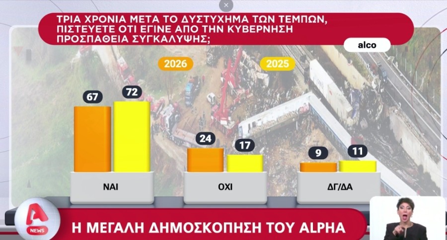 Την δυσαρέσκεια των πολιτών για τον Κυριάκο Μητσοτάκη, αλλά και τους κυβερνητικούς χειρισμούς για την υπόθεση των Τεμπών, τρία χρόνια μετά την τραγωδία, καταγράφει το δεύτερο μέρος της δημοσκόπησης της Alco για τον Alpha. Ενδεικτικό είναι ότι το 73% των πολιτών δεν πιστεύει ότι οι πραγματικοί ένοχοι για το σιδηροδρομικό δυστύχημα θα τιμωρηθούν, ενώ 2 στους 3 πιστεύουν ότι έγινε απόπειρα συγκάλυψης.