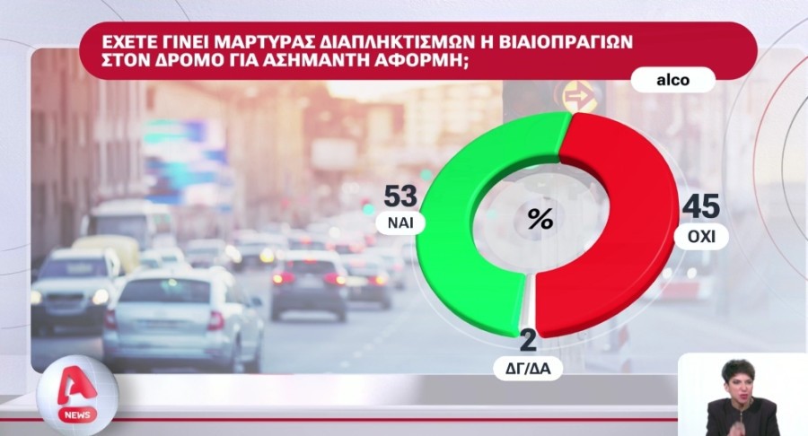 Τέλος, τέθηκε και το ερώτημα περί βιαιοπραγιών για ασήμαντη αφορμή στον δρόμο, φαινόμενο που παρατηρείται σχεδόν καθημερινά. Τα ποσοστά καταδεικνύουν μία καταθλιπτική και ανησυχητική εικόνα σημείωσε ο Κώστας Παναγόπουλος της Alco σχολιάζοντας τη συγκεκριμένη ερώτηση, καθώς το 53% απάντησε θετικά στο ερώτημα.