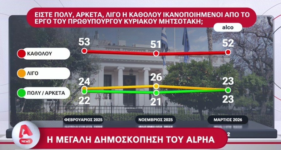 Συγκεκριμένα, καθόλου ικανοποιημένοι δηλώνουν οι πολίτες από το έργο του Κυριάκου Μητσοτάκη, καθώς ο πρωθυπουργός συγκεντρώνει αρνητικό ποσοστό 52% ενώ λίγο ικανοποιημένο δηλώνει το 23%.