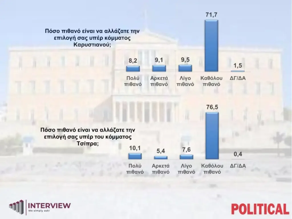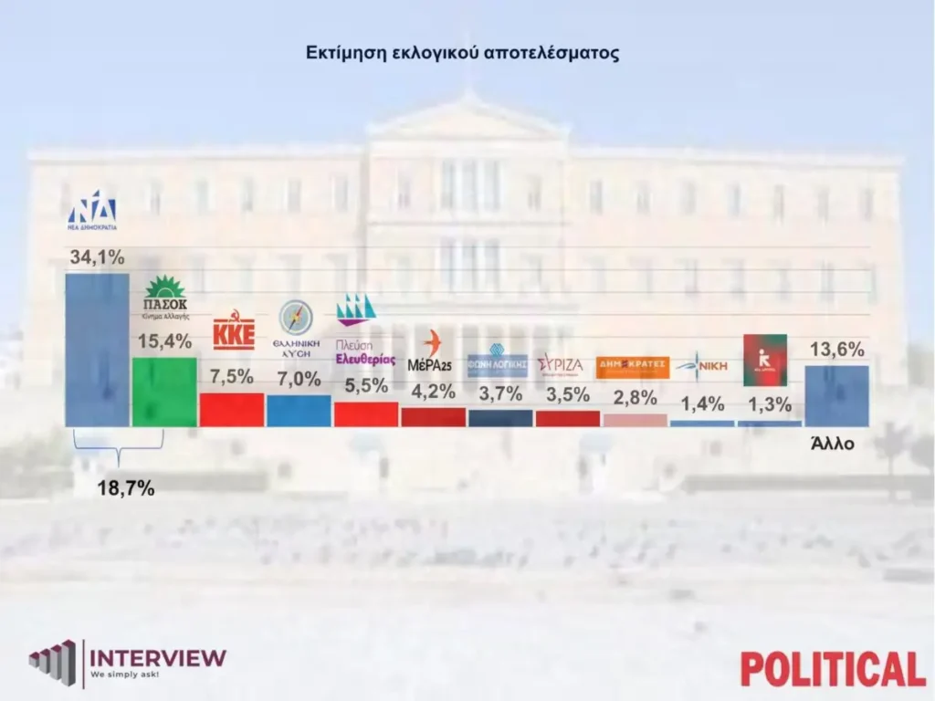 Στην ερώτηση «αν είχαμε εκλογές την επόμενη Κυριακή, εσείς ποιο κόμμα θα ψηφίζατε;», η ΝΔ λαμβάνει ποσοστό 28,5%, αυξημένο κατά σχεδόν δύο μονάδες σε σχέση με την προηγούμενη δημοσκόπηση της Interview.