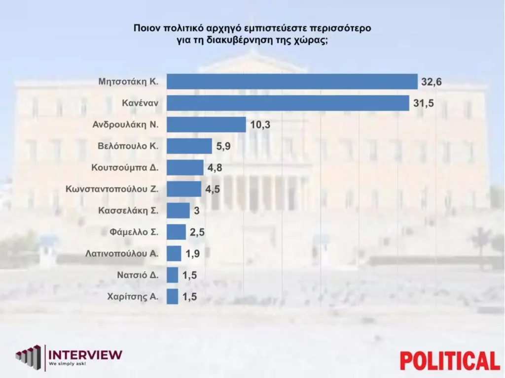 Στην ερώτηση «ποιον πολιτικό αρχηγό εμπιστεύεστε περισσότερο για τη διακυβέρνηση της χώρας;», ο πρωθυπουργός Κυριάκος Μητσοτάκης διατηρεί το προβάδισμα έναντι των υπόλοιπων αρχηγών των κομμάτων της αντιπολίτευσης.