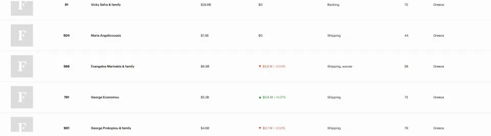 Η πλουσιότερη Ελληνίδα Βίκυ Σαφρά και η οικογένεια της βρίσκεται στην 94η θέση της κατάταξης με 26,8 δισεκατομμύρια δολάρια, ενώ ακολουθεί η Μαρία Αγγελικούση (509) με 7,4 δισ. δολάρια, ο Ευάγγελος Μαρινάκης (567) με 6,9 δισ. δολάρια, ο Γιώργος Οικονόμου (806) με 5,3 δισ. δολάρια και ο Γιώργος Προκοπίου (908) με 4,6 δισ. δολάρια.