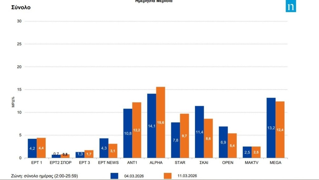 Για τρίτη συνεχόμενη μέρα με επίδοση πάνω από 15,5% ο Alpha και συνολική 10η ημέρα παραμονής στην πρώτη θέση προτιμήσεων των τηλεθεατών.