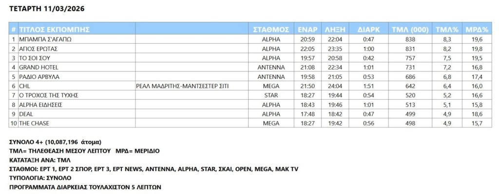 Με «διαγώνια ματιά» στο ημερήσιο τηλεβαρόμετρο γίνεται αντιληπτό πως οι μισές θέσεις καταλήφθηκαν από προτάσεις του Alpha, και ειδικότερα από τις εκπομπές της απογευματινής ζώνης και έπειτα, έως την ολοκλήρωση των ελληνικών σειρών του prime time.