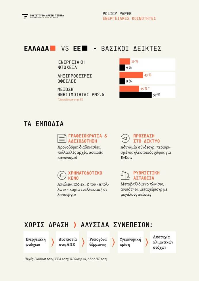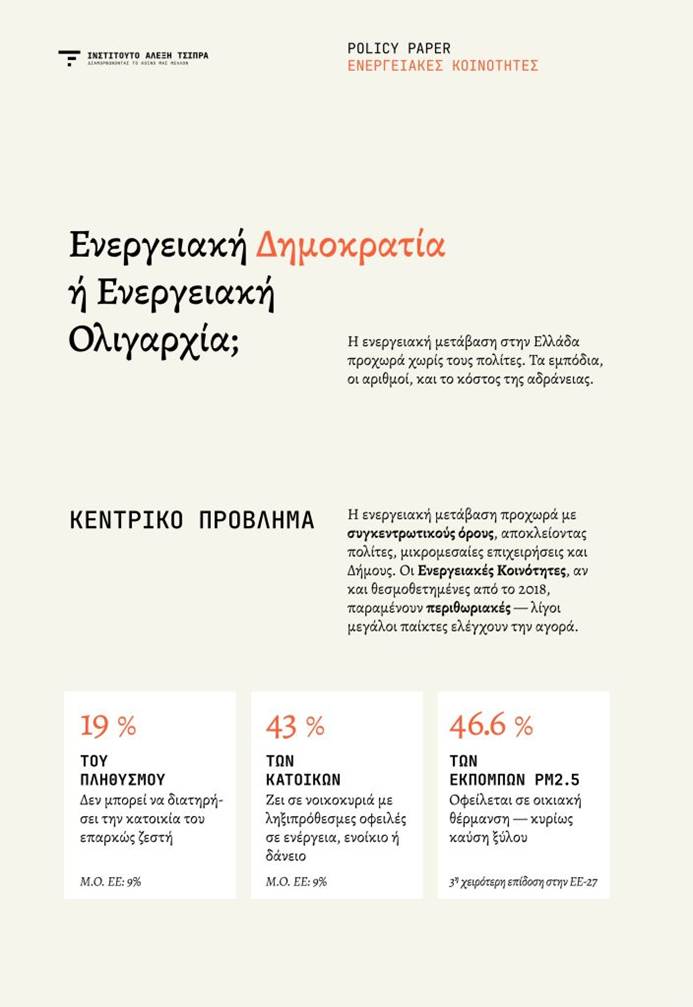 Το πρόβλημα: Η ενεργειακή μετάβαση στην Ελλάδα προχωρά με συγκεντρωτικούς όρους, αποκλείοντας πολίτες, μικρομεσαίες επιχειρήσεις και Δήμους από τη συμμετοχή στην παραγωγή ενέργειας. Οι Ενεργειακές Κοινότητες (ΕνΚοιν), αν και θεσμοθετημένες από το 2018, παραμένουν περιθωριακές λόγω ρυθμιστικών εμποδίων, γραφειοκρατίας και έλλειψης χρηματοδότησης. Παράλληλα, η Ελλάδα εμφανίζει υψηλά ποσοστά ενεργειακής φτώχειας (19% του πληθυσμού) και μία από τις τρεις χειρότερες επιδόσεις στην ΕΕ σε θέματα ατμοσφαιρικής ρύπανσης από οικιακή θέρμανση.