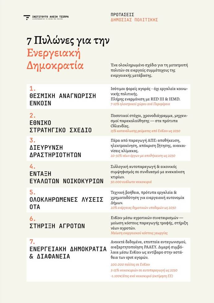 Η πρόταση: Θεσμική αναγνώριση των ΕνΚοιν ως ισότιμων φορέων της αγοράς, εθνικό στρατηγικό σχέδιο με ποσοτικούς στόχους, διεύρυνση δραστηριοτήτων (αποθήκευση, ηλεκτροκίνηση, ανακαινίσεις), ένταξη ευάλωτων νοικοκυριών, και στοχευμένη στήριξη ΟΤΑ και αγροτών.