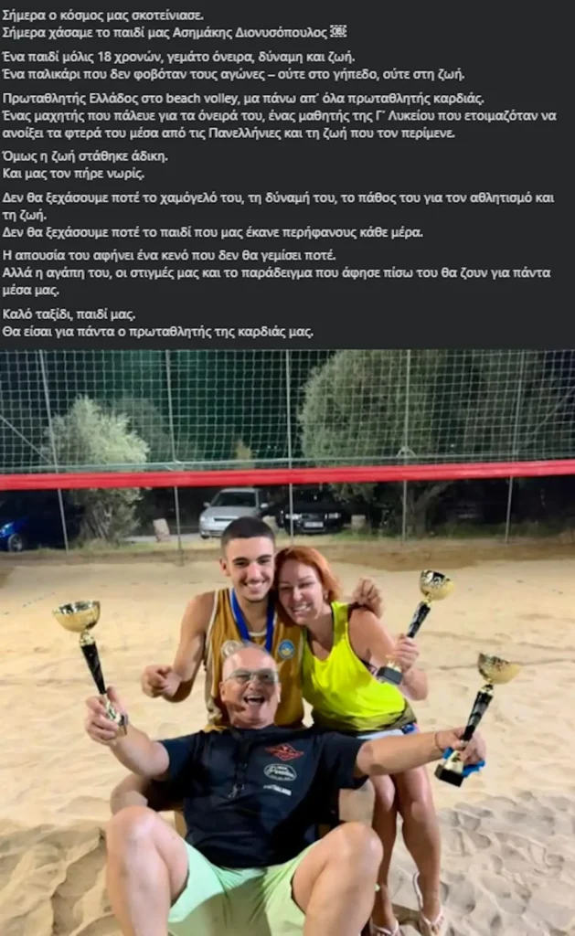 Ένα παιδί μόλις 18 χρονών, γεμάτο όνειρα, δύναμη και ζωή. Ένα παλικάρι που δεν φοβόταν τους αγώνες – ούτε στο γήπεδο, ούτε στη ζωή. Πρωταθλητής Ελλάδος στο beach volley, μα πάνω απ’ όλα πρωταθλητής καρδιάς.