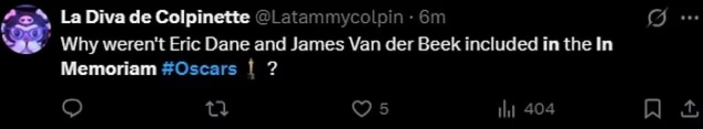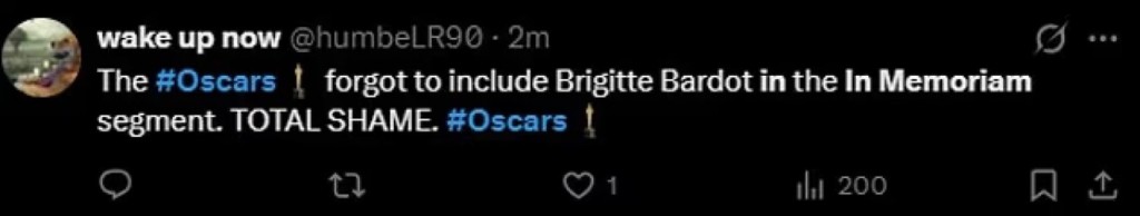 «Γιατί δεν συμπεριλήφθησαν οι Έρικ Ντέιν και Τζέιμς Βαν Ντερ Μπικ στο In Memoriam;» είπε κάποιος. «Η απουσία της Μπριζίτ Μπαρντό είναι πραγματικά σοκαριστική» ανέφερε κάποιος άλλος, με ορισμένους να χαρακτηρίζουν την παράλειψη «ντροπιαστική».