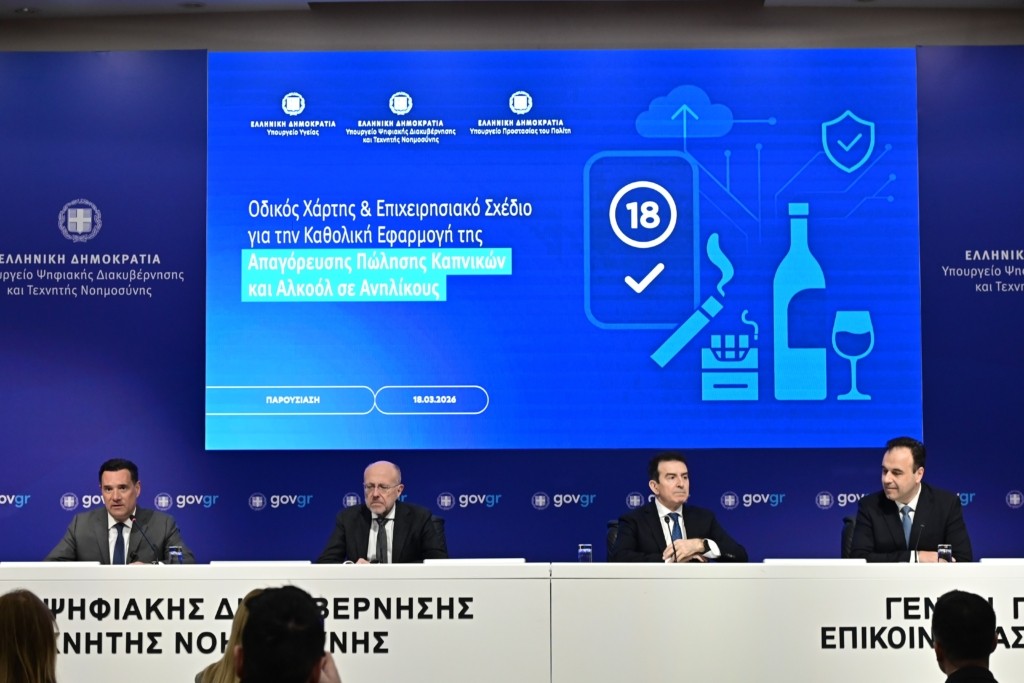 Ο οδικός χάρτης και το επιχειρησιακό σχέδιο για την καθολική εφαρμογή της απαγόρευσης πώλησης καπνικών προϊόντων και αλκοόλ σε ανηλίκους παρουσιάστηκαν σε εκδήλωση που πραγματοποιήθηκε στην αίθουσα εκδηλώσεων του υπουργείου Ψηφιακής Διακυβέρνησης, με τη συμμετοχή των υπουργών Υγείας, Άδωνι Γεωργιάδη, Ψηφιακής Διακυβέρνησης, Δημήτρη Παπαστεργίου, Προστασίας του Πολίτη, Μιχάλη Χρυσοχοΐδη και του υφυπουργού Υγείας, Δημήτρη Βαρτζόπουλου.