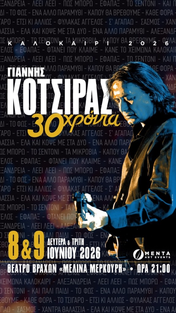 Τα 30 χρόνια στη δισκογραφία γιορτάζει ο Γιάννης Κότσιρας στο Θέατρο Βράχων – Μελίνα Μερκούρη τη Δευτέρα 8 Ιουνίου & Τρίτη 9 Ιουνίου.