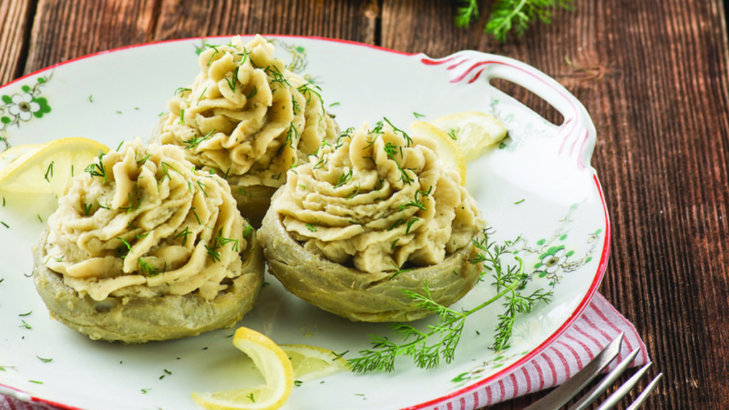 Ένα πεντανόστιμο ορεκτικό ή μεζεδάκι, που συνδυάζει τη βελούδινη φάβα από κουκιά με τις αγαπημένες και ωφέλιμες αγκινάρες.