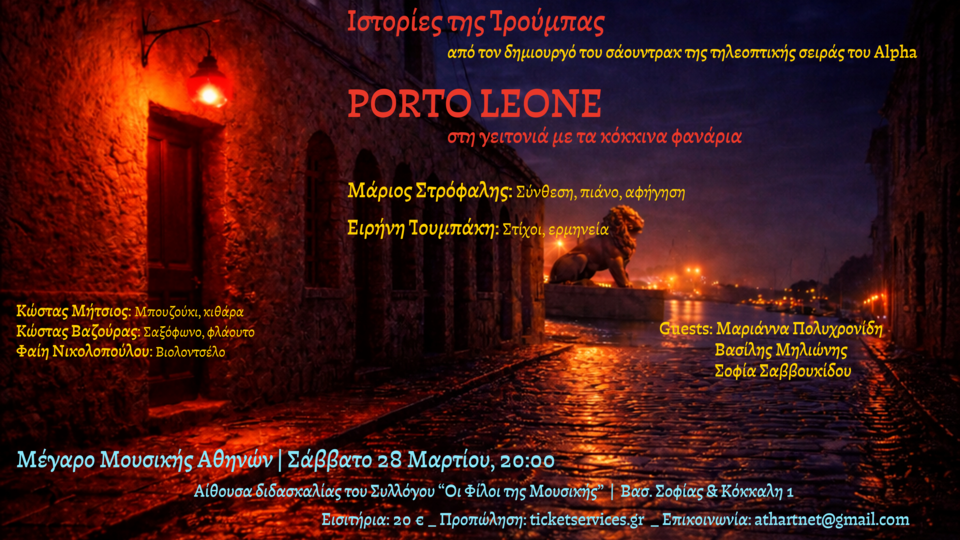 Ο Μάριος Στρόφαλης, ο δημιουργός του soundtrack της τηλεοπτικής σειράς του Alpha “Porto Leone, στη γειτονιά με τα κόκκινα φανάρια” μας προσκαλεί το Σάββατο 28 Μαρτίου στο Μέγαρο Μουσικής Αθηνών για μία μοναδική συναυλία!