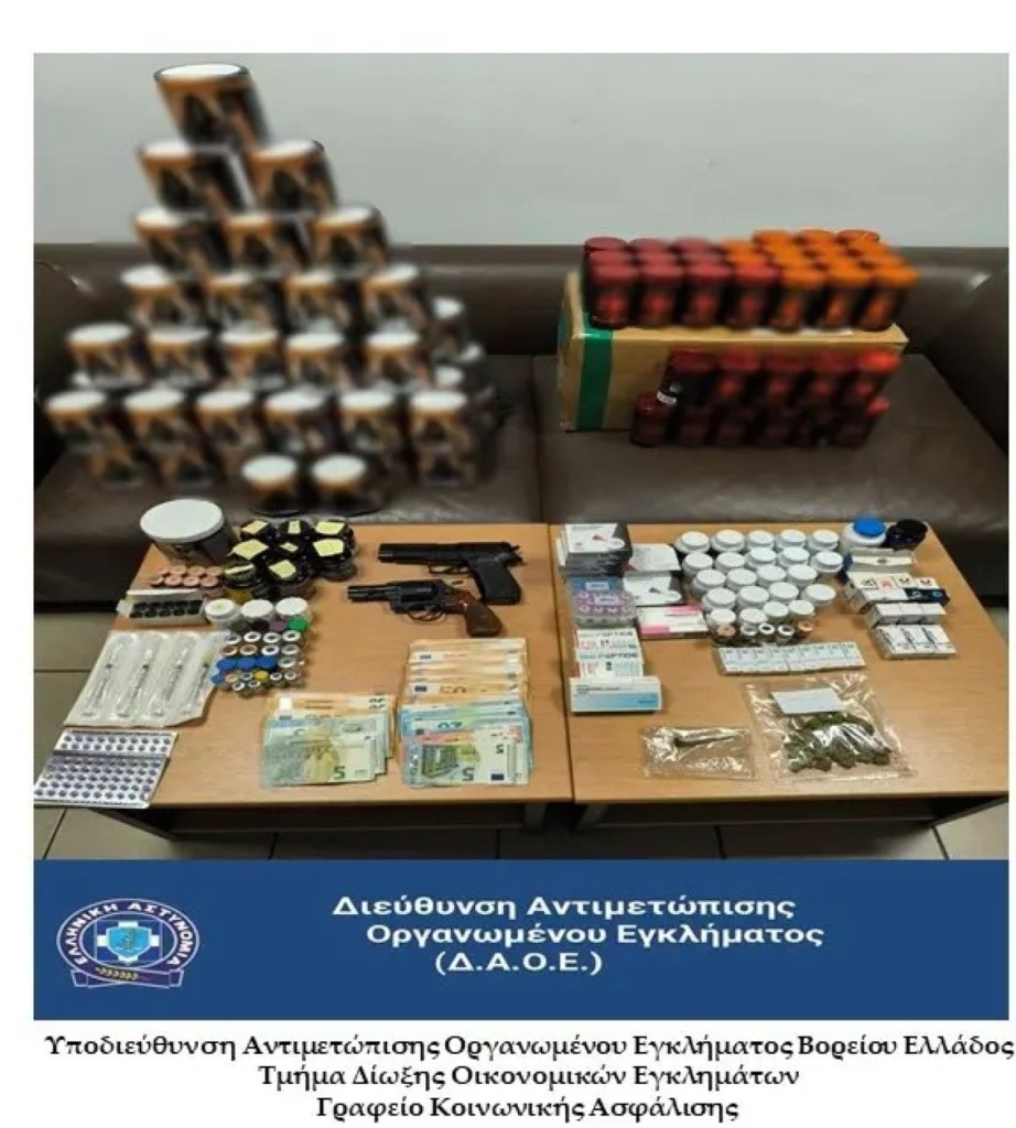 Σύμφωνα με την Αστυνομία, στην κατοχή των συλληφθέντων βρέθηκαν 5.263 κάψουλες και δισκία, 362 ενέσιμα φιαλίδια και σχεδόν 16 κιλά σκόνης αναβολικών, φαρμακευτικών σκευασμάτων και συμπληρωμάτων διατροφής, αεροβόλο πιστόλι, περίστροφο κρότου και ποσότητα ακατέργαστης κάνναβης.
