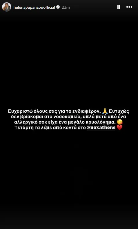 «Ευτυχώς δεν βρίσκομαι στο νοσοκομείο αλλά μετά από ένα αλλεργικό σοκ, είχα ένα μεγάλο κρυολόγημα. Τετάρτη τα λέμε από κοντά στο Nox Athens» έγραψε η τραγουδίστρια στο Instagram, διαψεύδοντας τις αρχικές πληροφορίες του δημοσιογράφου για νέα νοσηλεία της στο Νοσοκομείο.