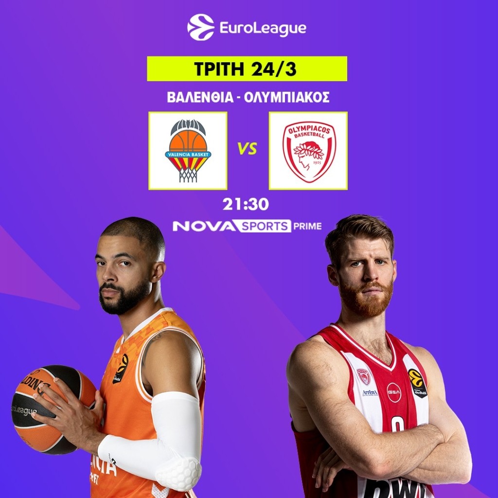 21:30 EuroLeague: Βαλένθια-Ολυμπιακός Novasports Prime σε περιγραφή του Χρήστου Καούρη