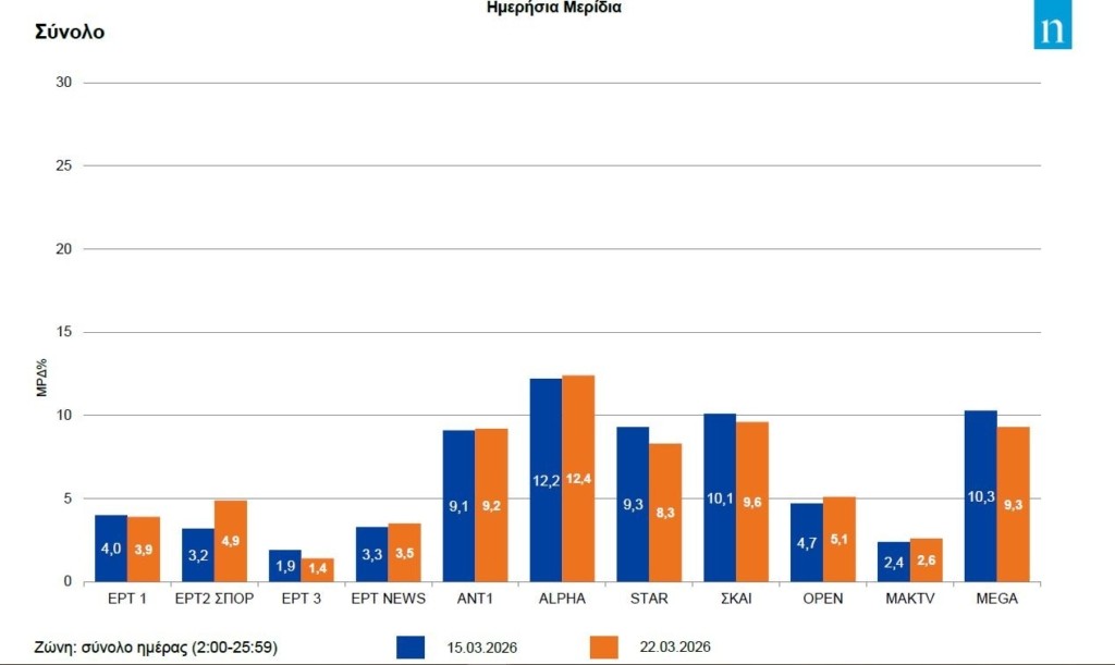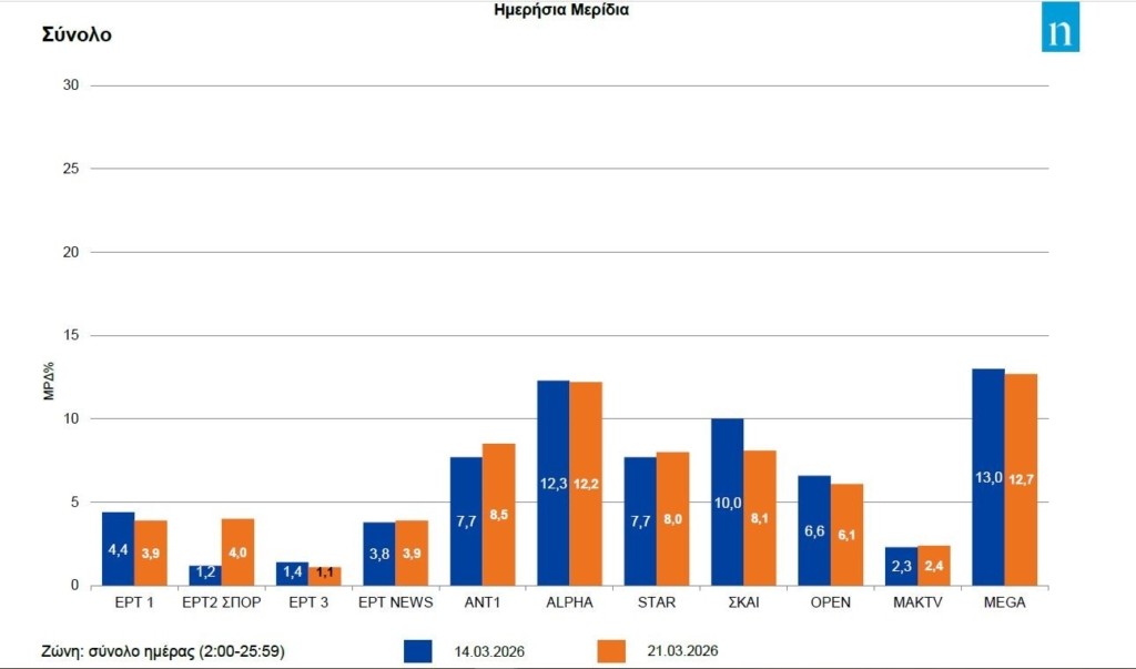 Ο Alpha ρεφάρισε την Κυριακή, συγκρατώντας το σύνολο της δυναμικής του με μικρή τάση ανόδου, ενώ το Mega έκανε «βουτιά» καταγράφοντας απώλειες σχεδόν τρεισήμισι μονάδων σε σχέση με τη σαββατιάτικη επίδοση του.