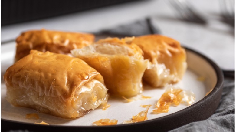 5. Για τα μπουρεκάκια, πάρτε ένα φύλλο (σκεπάζοντας τα υπόλοιπα με μια πετσέτα για να μην ξεραθούν), διπλώστε το στα 3, βουτυρώστε το καλά και τοποθετήστε στην άκρη του μια γεμάτη κουταλιά της σούπας από την κρέμα. Διπλώστε τα πλαϊνά μέρη του φύλλου ώστε να καλύπτουν λίγο την κρέμα, βουτυρώστε τα και τυλίξτε σε ρολάκι. Αν θέλετε μπορείτε να κόψετε λωρίδες από το φύλλο και να διπλώσετε σε τρίγωνα κομμάτια (όπως τα τυροπιτάκια τηγανιού) προσέχοντας να βουτυρώσετε πάλι καλά όλες τις μεριές του.