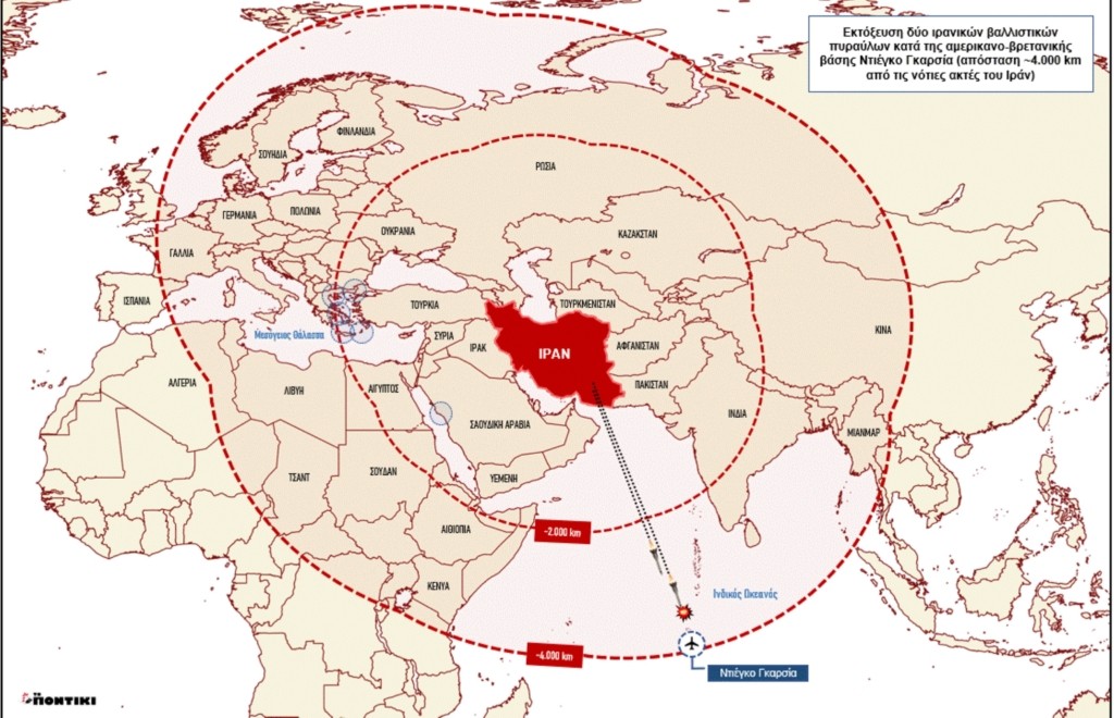 Σύμφωνα με την εφημερίδα «The Wall Street Journal», το Ιράν εκτόξευσε το Σάββατο δύο βαλλιστικούς πυραύλους εναντίον της αμερικανοβρετανικής βάσης του Ντιέγκο Γκαρσία στον Ινδικό Ωκεανό, σημειώνοντας την πιο μακρινή απόπειρα πυραυλικής επίθεσης στην ιστορία του.
