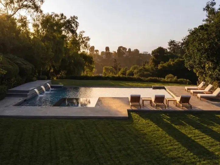 Τοποθετημένη σε έναν ήσυχο δρόμο, η έπαυλη σε στιλ θέρετρου διαθέτει 8 υπνοδωμάτια και 10 μπάνια, προσφέροντας πανοραμική θέα στην πόλη και το φυσικό τοπίο από ένα ιδιωτικό οικόπεδο. Σχεδιασμένο τόσο για την καθημερινότητα όσο και για ψυχαγωγία μεγάλης κλίμακας, το σπίτι προσφέρει ιδιωτικό κινηματογράφο, αίθουσα παιχνιδιών με wet bar, γραφείο στελεχών με τζάκι, γυμναστήριο και αίθουσα μασάζ.