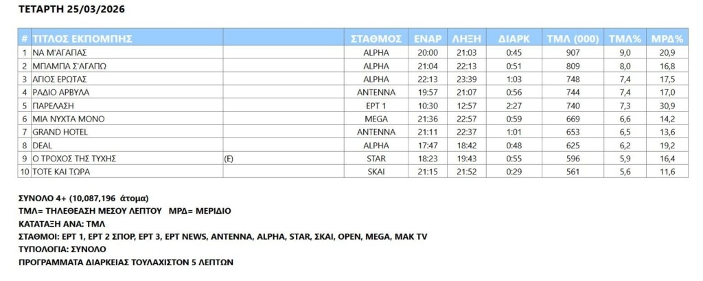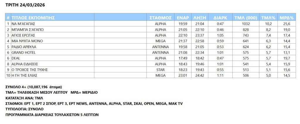 Παρέλαση τηλεθέασης με «Να μ΄αγαπάς» και την Τρίτη (24/3) και την Τετάρτη (25/3)