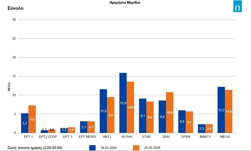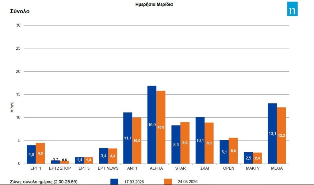 Την Τετάρτη επίσης, χάρη στην απευθείας μετάδοση της στρατιωτικής παρέλασης, η ΕΡΤ1 είδε το μερίδιό της να διαμορφώνεται στο 7,3% και έπειτα από καιρό να προσπερνά το Open.
