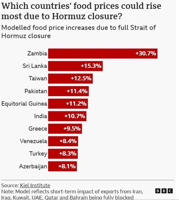 Ερευνητές προειδοποιούν ότι ακόμη και μια σύντομη διακοπή θα μπορούσε να διαταράξει ολόκληρη την καλλιεργητική περίοδο, με μακροχρόνιες συνέπειες για την επισιτιστική ασφάλεια. Εκτιμήσεις δείχνουν ότι ένα πλήρες κλείσιμο του Ορμούζ θα μπορούσε να αυξήσει τις τιμές του σιταριού κατά 4,2% και των φρούτων και λαχανικών κατά 5,2%, με χώρες όπως η Ζάμπια, η Σρι Λάνκα, η Ταϊβάν και το Πακιστάν να πλήττονται περισσότερο.