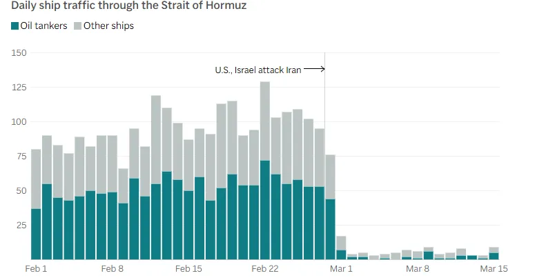 Μέχρι τις 17 Μαρτίου, το Ιράν είχε στοχοποιήσει άμεσα περίπου 20 δεξαμενόπλοια, ωστόσο ακόμη και αυτή η περιορισμένη δράση ήταν αρκετή για να εκτοξεύσει το κόστος ασφάλισης και να αποθαρρύνει άλλα πλοία από το να διασχίσουν τα Στενά του Ορμούζ.