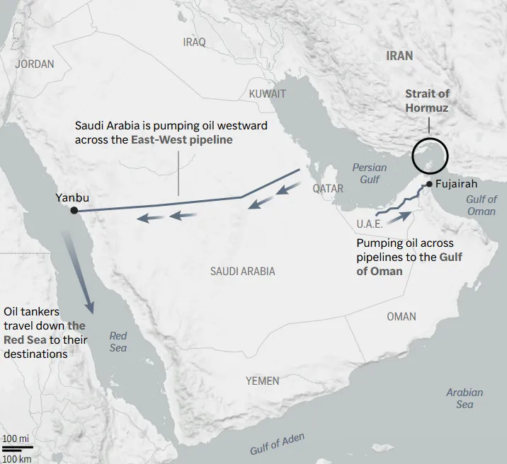 Και ακόμη και η μεταφορά του πετρελαίου πέρα από τα Στενά του Ορμούζ δεν σημαίνει απαραίτητα ότι βρίσκεται εκτός κινδύνου. Το Ιράν έχει πλήξει το Γιανμπού, στις ακτές της Σαουδικής Αραβίας στην Ερυθρά Θάλασσα, καθώς και το λιμάνι Φουτζέιρα των Ηνωμένων Αραβικών Εμιράτων, λίγο έξω από τα Στενά.
