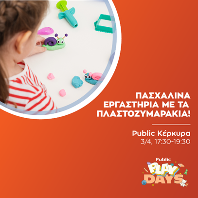 Τα Public και η Hasbro, σας προσκαλούν σε μια διαδραστική εκδήλωση με τα αγαπημένα σας πλαστοζυμαράκια Playdoh το Σάββατο 04/4 στις 17:30 έως 19:30 στο Public Κέρκυρα.