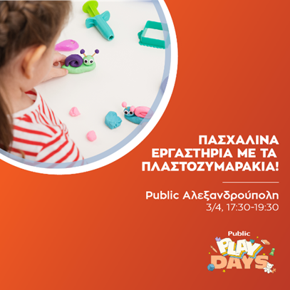 Τα Public και η Hasbro, σας προσκαλούν σε μια διαδραστική εκδήλωση με τα αγαπημένα σας πλαστοζυμαράκια Playdoh την Παρασκευή 03/4 στις 17:30 έως 19:30 στο Public Αλεξανδρούπολη.