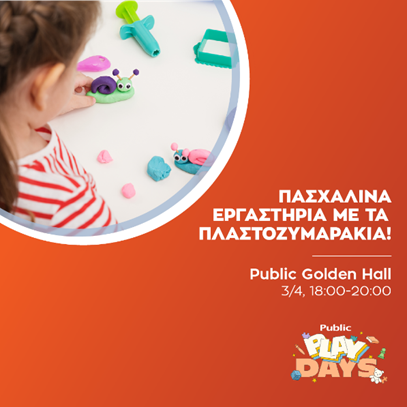 Τα Public και η Hasbro, σας προσκαλούν σε μια διαδραστική εκδήλωση με τα αγαπημένα σας πλαστοζυμαράκια Playdoh την Παρασκευή 03/4 στις 18:00 έως 20:00 στο Public Golden Hall.