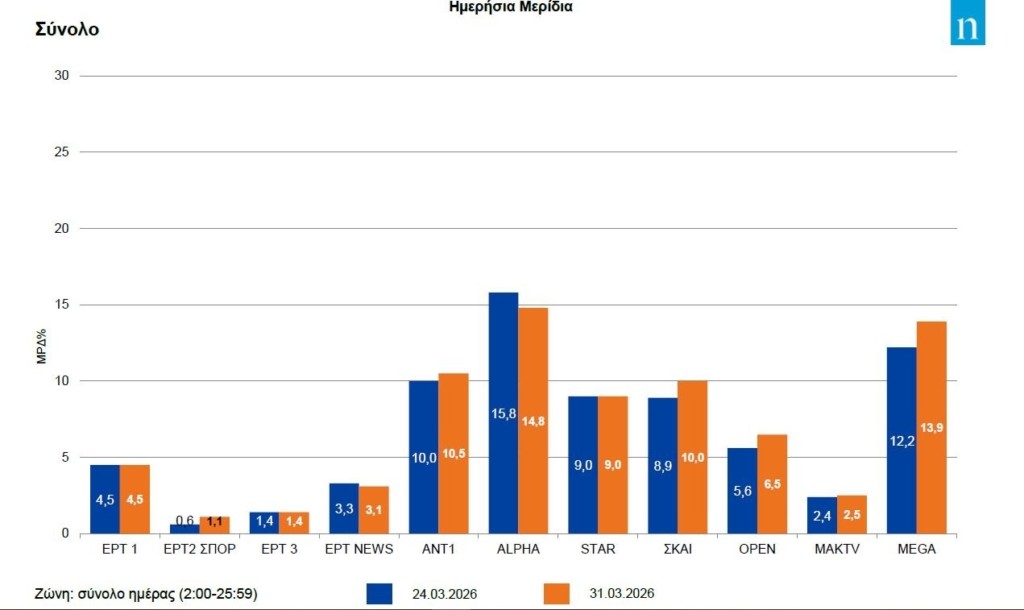 Η Τρίτη ήταν η δεύτερη ημέρα στη σειρά κατά την οποία τέσσερα κανάλια είχαν διψήφια μερίδια τηλεθέασης. Όμως από τη μια ημέρα στην άλλη Alpha και Mega βελτίωσαν τις επιδόσεις του ενώ εκείνες των ΑΝΤ1 και ΣΚΑΪ εμφάνισαν απώλειες.