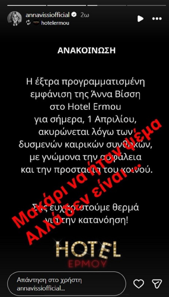 Στην ανακοίνωση αναφέρεται: «Η έξτρα προγραμματισμένη εμφάνιση της Άννα Βίσση στο Hotel Ermou για σήμερα, 1 Απριλίου, ακυρώνεται λόγω των δυσμενών καιρικών συνθηκών, με γνώμονα την ασφάλεια και την προστασία του κοινού. Σας ευχαριστούμε θερμά για την κατανόηση».