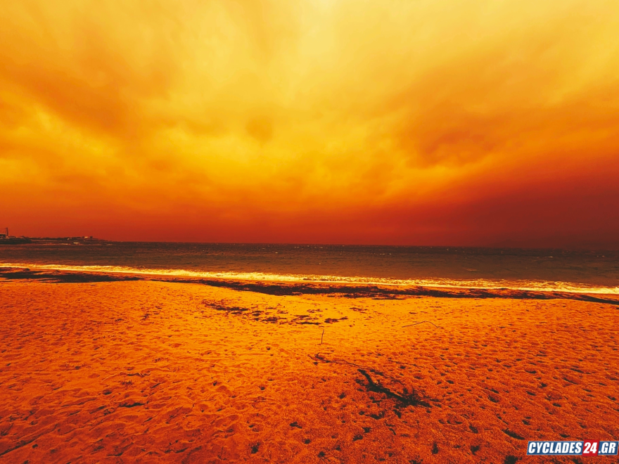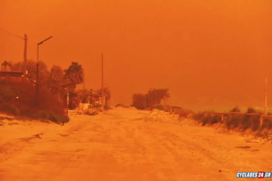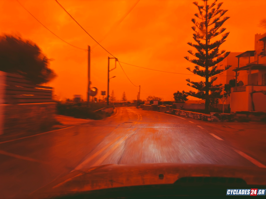 Συγκεκριμένα, στη Νάξο, στη Σαντορίνη, στην Τήνο και στη Σύρο η ορατότητα περιορίζεται σημαντικά με τον ουρανό να έχει πάρει ένα χαρακτηριστικό πορτοκαλί – κόκκινο χρώμα σύμφωνα με το cyclades24.gr.