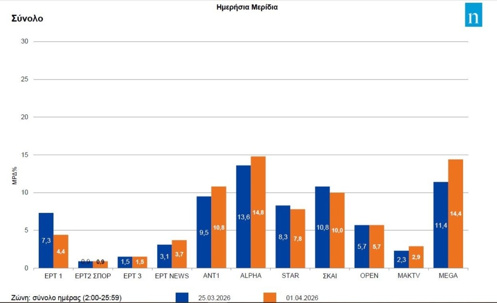 Κάτω της μισής μονάδας διαμορφώθηκε η διαφορά μεταξύ Alpha και Mega χθες, πρώτη του μήνα. Η δυναμική του Alpha ήταν ίδια με εκείνη της Τρίτης, όμως το Mega με το «Αλ Τσαντίρι νιουζ» «ροκάνισε» την μεταξύ τους απόσταση, καταφέρνοντας το δεύτερο 14άρι σε διάστημα σχεδόν δύο εβδομάδων (20/3).