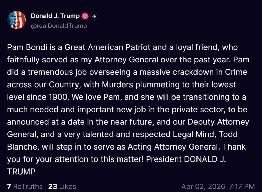 Ο πρόεδρος των ΗΠΑ Ντόναλντ Τραμπ απέπεμψε την υπουργό Δικαιοσύνης Παμ Μπόντι, όπως δήλωσε ο ίδιος μιλώντας στο αμερικανικό τηλεοπτικό δίκτυο Fox News.