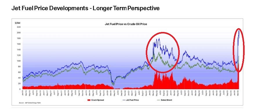 Ένας από τους λόγους που παρατηρείται αυτή η καθίζηση είναι και η ραγδαία αύξηση στη τιμή των καυσίμων στα αεροσκάφη. Η τιμή τους υπερδιπλασιάστηκε μέσα στον Μάρτιο, ξεπερνώντας τα 1.700 δολάρια ανά τόνο,από περίπου 800 δολάρια που ήταν τον Φεβρουάριο. Αυτή η εκτόξευση των τιμών σε ποσοστό… 110%, έφερε πιέσεις στα λειτουργικά κόστη, οδηγώντας σε αυξήσεις από 7 έως 15%.
