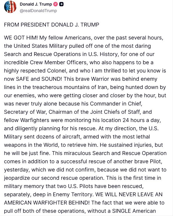 «Τον έχουμε. Αγαπητοί μου Αμερικανοί, τις τελευταίες ώρες οι Ένοπλες Δυνάμεις των ΗΠΑ πραγματοποίησαν μία από τις πιο τολμηρές επιχειρήσεις έρευνας και διάσωσης στην ιστορία των ΗΠΑ, για έναν από τους εξαιρετικούς μας αξιωματικούς πληρώματος, ο οποίος είναι επίσης ένας ιδιαίτερα σεβαστός Συνταγματάρχης, και με χαρά σας ενημερώνω ότι είναι πλέον ΑΣΦΑΛΗΣ ΚΑΙ ΥΓΙΗΣ!», ανέφερε μεταξύ άλλων στην ανάρτησή του.