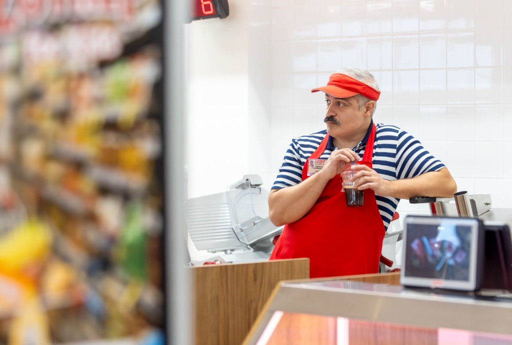 Στον πάγκο με τα τυριά και τα αλλαντικά, ο… ολίγον πρωτόγονος Περικλής (Σταύρος Μαρκάλας) δεν χάνει ευκαιρία να τραγουδάει καψουροτράγουδα, να την «πέφτει» στις πελάτισσες και, κυρίως, να σπάει τα νεύρα της εντυπωσιακά όμορφης και εντυπωσιακά ζόρικης βίγκαν χασάπισσας, Χαριστέλλας (Νατάσα Εξηνταβελώνη), που δεν σηκώνει μύγα… στον μπαλτά της.