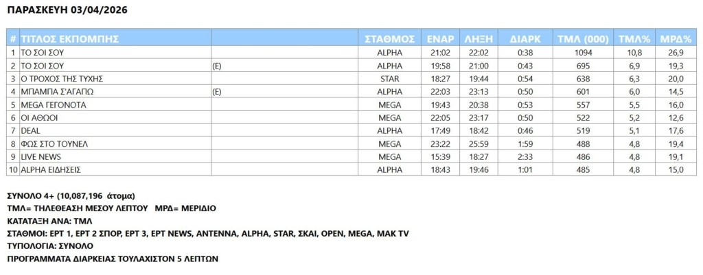 Και σαν σε… monopoli «καβάτζωσε» και τη δεύτερη θέση του τηλεβαρόμετρου της ημέρας με το επαναληπτικό επεισόδιο που ήταν αυτό- το δεύτερο σε πασχαλινή ατμόσφαιρα– το οποίο είχε μεταδοθεί σε πρώτη προβολή το ακριβώς προηγούμενο βράδυ. Τομπολα.