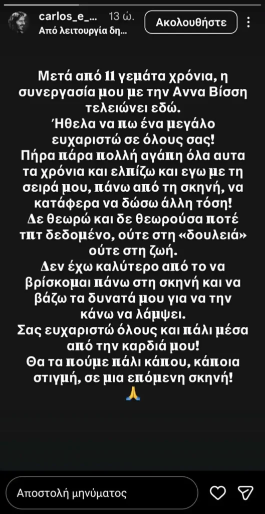 «Μετά από 11 γεμάτα χρόνια, η συνεργασία μου με την Άννα Βίσση τελειώνει εδώ. Ήθελα να πω ένα μεγάλο ευχαριστώ σε όλους σας! Πήρα πάρα πολύ αγάπη όλα αυτά τα χρόνια και ελπίζω και εγώ με τη σειρά μου, πάνω από τη σκηνή, να κατάφερα να δώσω άλλη τόση» ανέφερε, μεταξύ άλλων.