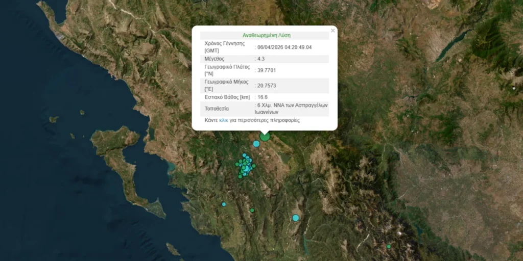 Σεισμός 4,3 βαθμών της κλίμακας Ρίχτερ σημειώθηκε στις 7:20 το πρωί της Μεγάλης Δευτέρας (06.04.2026) στα Ιωάννινα αναστατώνοντας τους κατοίκους.