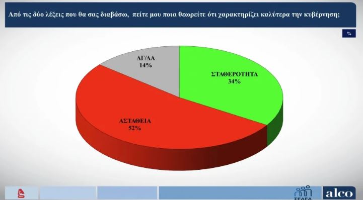 Στο ίδιο ερώτημα «ποια λέξη χαρακτηρίζει περισσότερο την κυβέρνηση», η λέξη «αστάθεια» λαμβάνει 52% και η λέξη «σταθερότητα» 34%. Ποσοστά που μάλλον δεν θα ακούστηκαν ιδιαίτερα καλά…