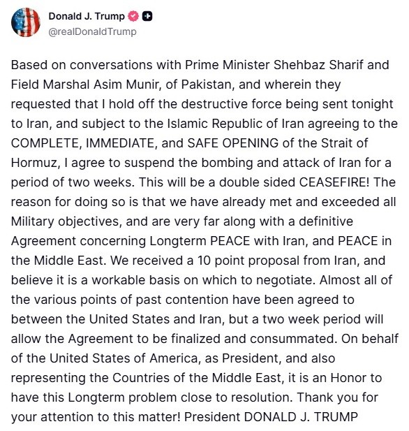 «Διπλή ΕΚΕΧΕΙΡΙΑ!» διακήρυξε ο Τραμπ, προσθέτοντας ότι σε αντάλλαγμα για τη διακοπή των βομβαρδισμών για δύο εβδομάδες, το Ιράν συμφώνησε στην «ΠΛΉΡΗ, ΆΜΕΣΗ και ΑΣΦΑΛΉ ΑΝΟΙΓΜΑ του Στενού του Ορμούζ». Εάν εκατοντάδες εγκλωβισμένα πετρελαιοφόρα μπορέσουν σύντομα να διαφύγουν από τον Περσικό Κόλπο, η καταστροφική ζημιά στην παγκόσμια οικονομία — ένα ζήτημα που έχει ήδη συμβάλει στην πτώση των ποσοστών αποδοχής του Τραμπ — ενδέχεται να αποφευχθεί. Τα μελλοντικά συμβόλαια μετοχών σημείωσαν άμεση άνοδο μετά από αυτές τις ελπιδοφόρες ειδήσεις. «Είναι τιμή να βρίσκεται αυτό το μακροχρόνιο πρόβλημα κοντά στην επίλυση», έγραψε ο Τραμπ.