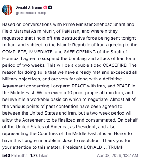 «Με βάση συνομιλίες με τον πρωθυπουργό του Πακιστάν Σεχμπάζ Σαρίφ και τον στρατάρχη Ασίμ Μουνίρ, κατά τις οποίες μου ζήτησαν να αναβάλω τη στρατιωτική ισχύ που επρόκειτο να χρησιμοποιηθεί απόψε εναντίον του Ιράν, και υπό την προϋπόθεση ότι η Ισλαμική Δημοκρατία του Ιράν θα συμφωνήσει στο ΠΛΗΡΕΣ, ΑΜΕΣΟ και ΑΣΦΑΛΕΣ ΑΝΟΙΓΜΑ του Στενού του Ορμούζ, συμφωνώ να αναστείλω τους βομβαρδισμούς και τις επιθέσεις κατά του Ιράν για περίοδο δύο εβδομάδων.