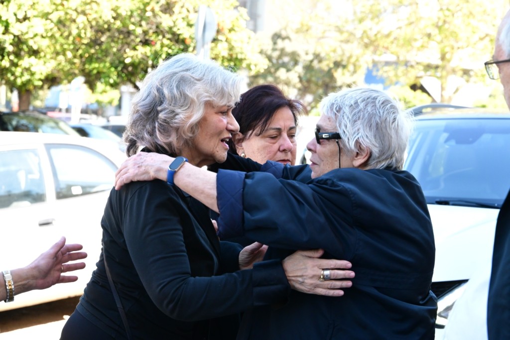 Συντετριμμένοι στην κηδεία, η Θεανώ Φωτίου, ο εγγονός της Δημήτρης και η σύντροφος του Βασίλη Ρίζου.